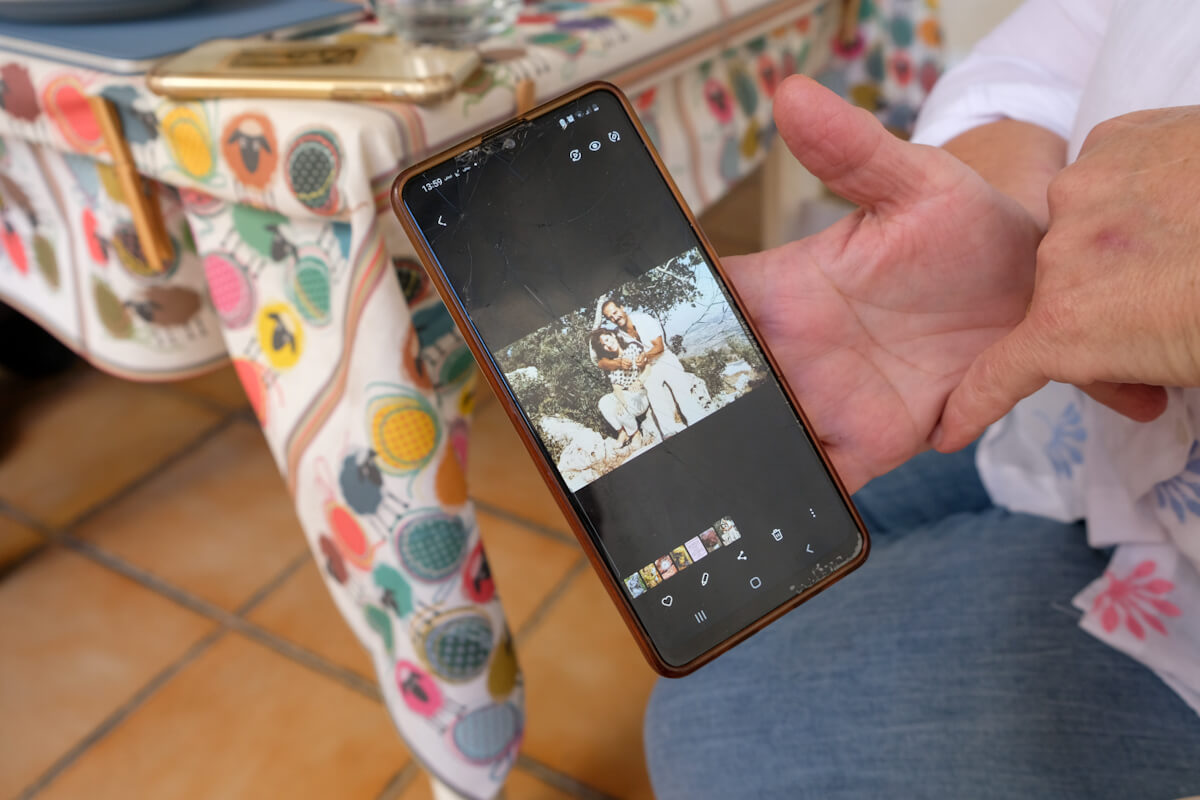 She takes out her phone and shows a photo of her and her late husband, sitting next to each other on a tractor, looking out over their fields. She has added a frame to the image, with tiny colorful hearts. There are also photos of her daughter, who stayed in the village where she lives in the south, taking care of animals – pigs, cows, a horse, and even pigeons – that sought shelter as the war worsened.