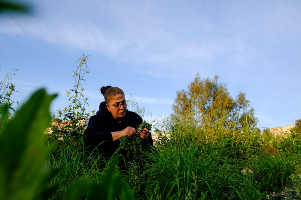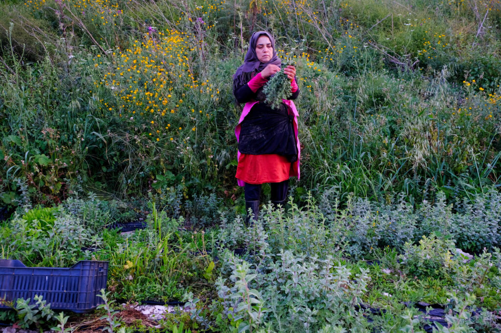 تضيف ماجدة، مشيرةً إلى النباتات الصغيرة الكثيفة ذات اللون الأخضر الباهت التي تنمو حول قدميها: “الزعتر الذي نزرعه هو من نوع الزُوبَع”.