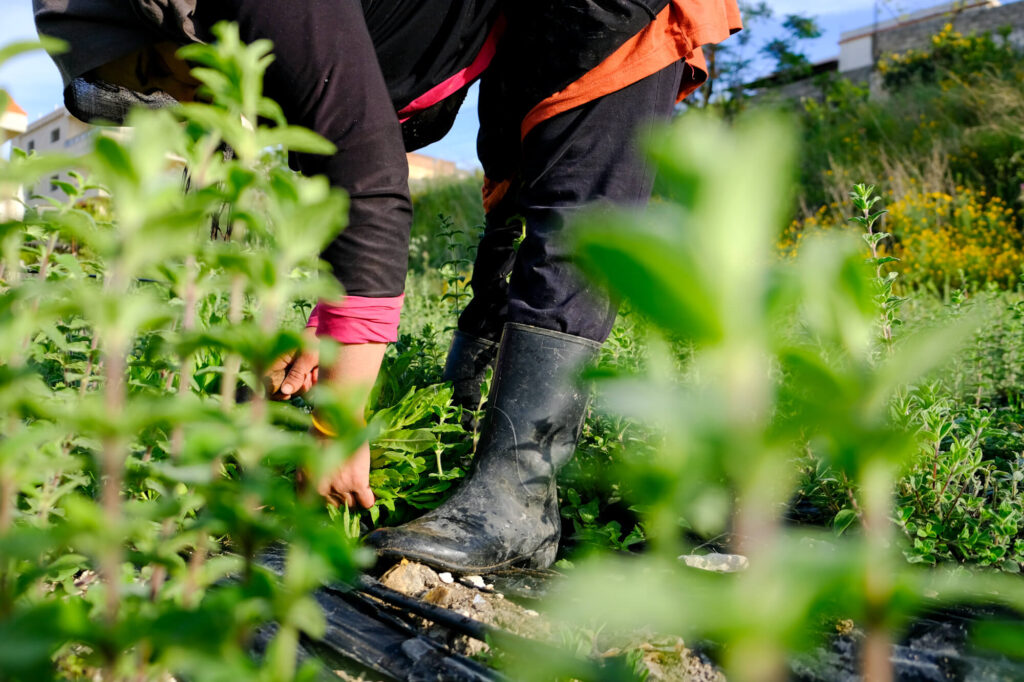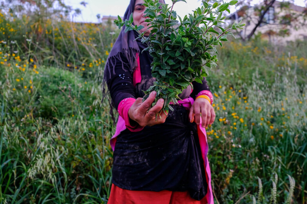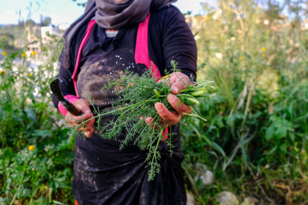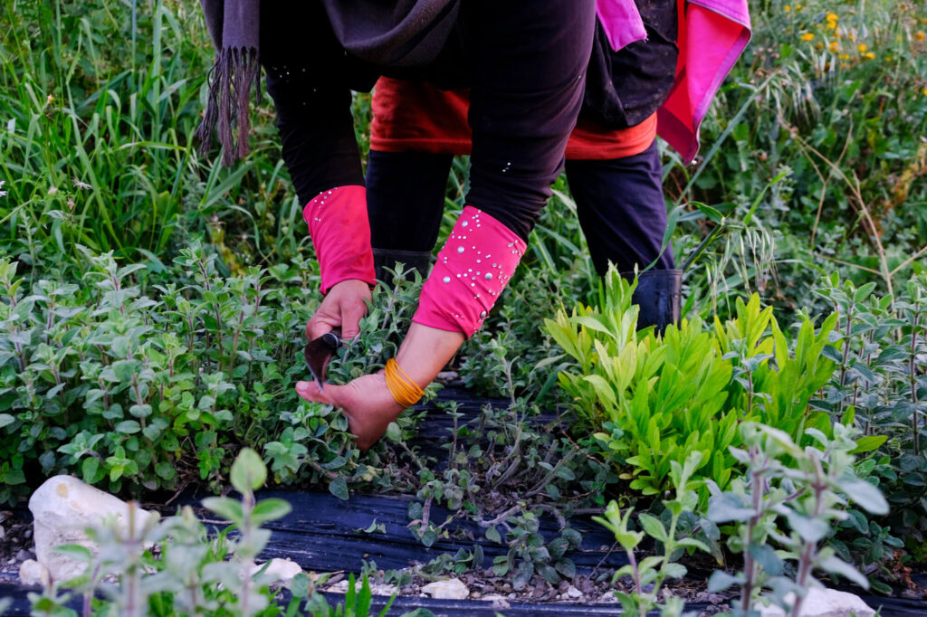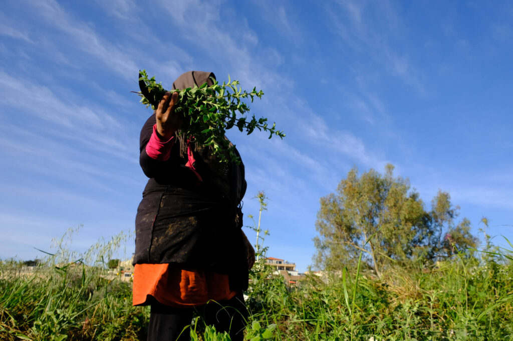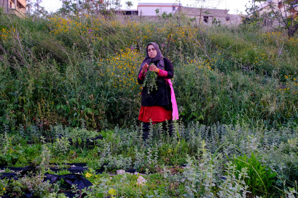 The women continue picking herbs as the sun slowly rises in the sky. They are five, all part of an agricultural cooperative in the village. Two of them – Majida and Suzane – are co-founders of the cooperative, which is women-led and was officially established in 2011 (though it began work in 2007). There is also Ghada Boutros, Majida’s sister, and two others, a woman who prefers to use the name Um Ibrahim and her daughter, Nour, who are hired specifically for the harvest.
